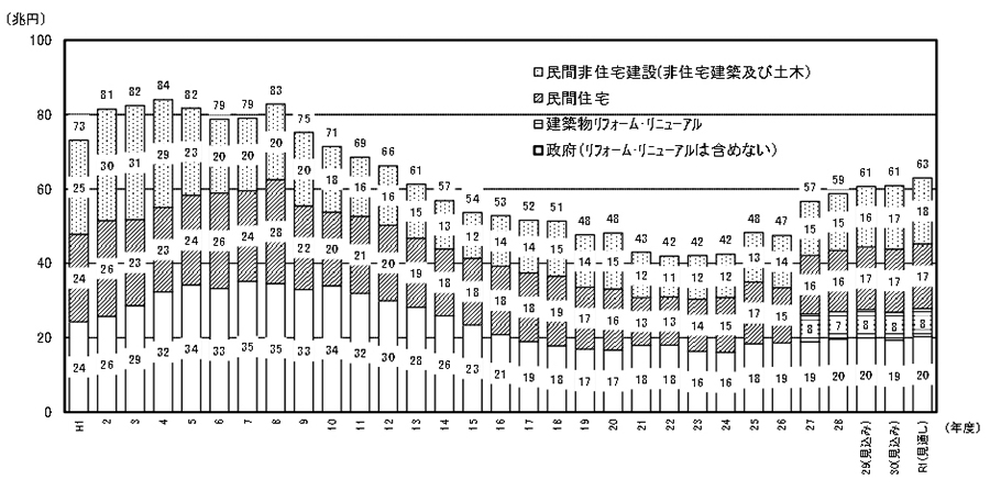建設投資額は、平成4年度の約84兆円をピークとして減少し、平成22年度には、平成4年度の半分程度である約42兆円まで落ち込みました。その後、東日本大震災の復興需要により回復基調となり、令和元年度の建設投資額は、約63兆円となりました。