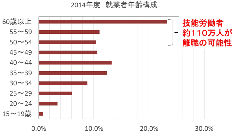 今後10年間で技能労働者は約110万人減少する見通しとなっており、新規の参入者数の増加はさほど見込めない状況です。