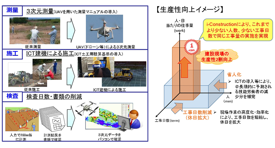 国土交通省は、調査・測量から設計、施工、検査、維持管理・更新までの全ての建設生産プロセスでICTなどを活用する「i-Construction」を推進し、建設現場の生産性を2025年までに2割向上を目指すとしています。