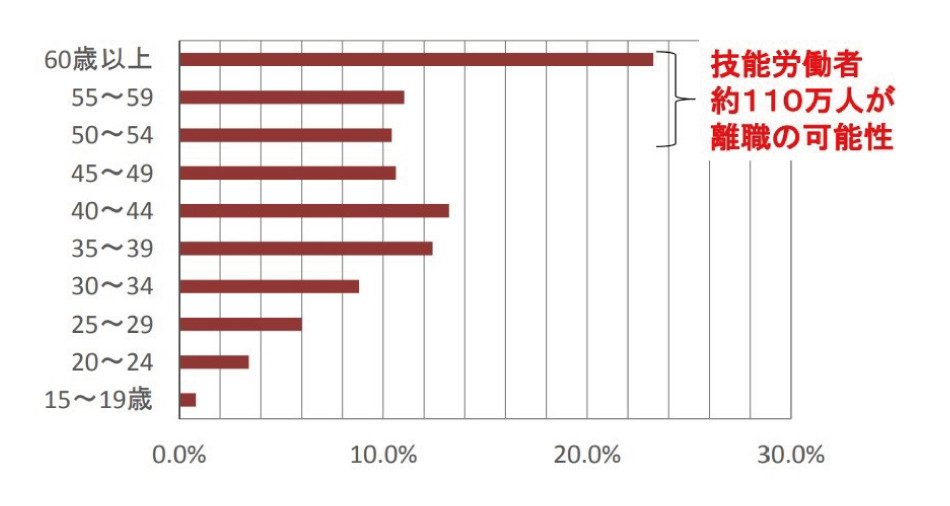 今後10年間に技能労働者(熟練者)は約110万人減少する見通しで、若年者(29歳以下)の新規参入者数の増加は見込めない状況と想定されています。