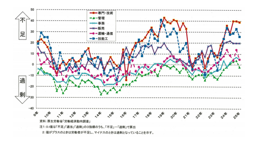 要因2として、「建設労働者を取り巻く状況について」(※参考資料のリンク付ける)において、建設業界における不足度合いの高い順に職種を記すると、専門・技術、技能工、販売、運輸・通信、事務、管理の順となります。