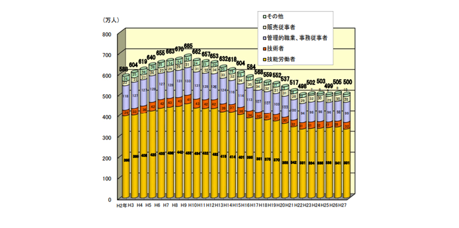| 技能労働者 | 455万人 | 331万人 | 331万人 | 124万人減少 |
