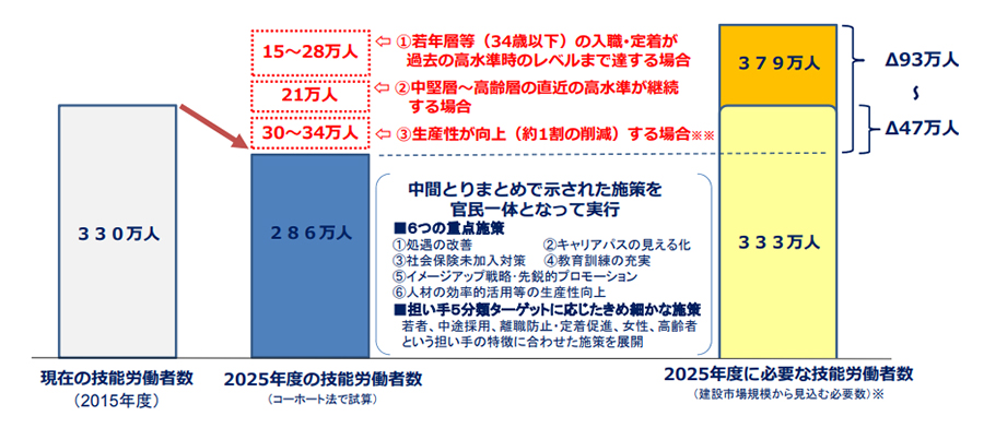 2025年の技能労働者数は、コーホート分析※によると約286万人と試算しています。一方、建設市場規模の見通しを踏まえ、2025年に必要な技能労働者数は333万人~379万人と試算しています。