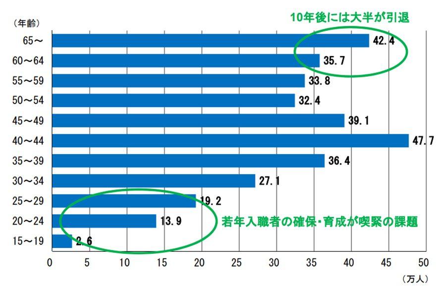 建設業就業者(技能労働者)の高齢化も進んでいます。国土交通省が公表した「建設産業の現状と課題」によると、年齢ごとの技能労働者数は下図の通りです。