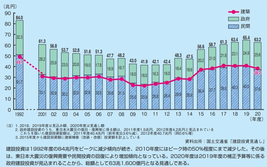 建設業界における建設投資額は、国土交通省による公表データ(2020年度)によると以下の通りです。